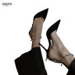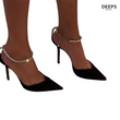 Close-up of the diamante embellished ankle chain and satin finish on women's Celestial court shoes in black, highlighting their elegant and sparkling features from DeepsLondon.