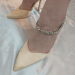 Woman's foot wearing stylish Celestial satin court shoes with diamante ankle chain in beige, a fashionable choice for London events from DeepsLondon.