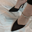Woman's foot wearing stylish Celestial satin court shoes with diamante ankle chain in black, a fashionable choice for London events from DeepsLondon.