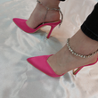 Close-up of the diamante embellished ankle chain and satin finish on women's Celestial court shoes in fuchsia, highlighting their elegant and sparkling features from DeepsLondon.