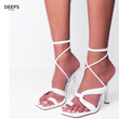 Embrace free-spirited style with our Riley lace-up high heels. These unique women's sandals feature a comfortable toe loop and a stylish knot detail, complemented by a chic lace-up design that wraps elegantly around the ankle, all set upon a high heel. Perfect for adding a touch of bohemian flair to any London occasion. Available in classic black and crisp white.