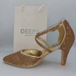 Adorn your feet with delicate elegance in our Maya low knitted heel strappy court shoes. These exquisite women's heels feature a unique knitted design on a comfortable low heel and stylish straps that gracefully frame the foot. Perfect for parties, weddings, and any special occasion in London where you want to radiate refined charm. Available in radiant gold and shimmering silver.