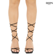 Woman's foot wearing stylish Talon lace-up square toe high heels with strappy toe post in black, a fashionable and confident choice for London events from DeepsLondon.